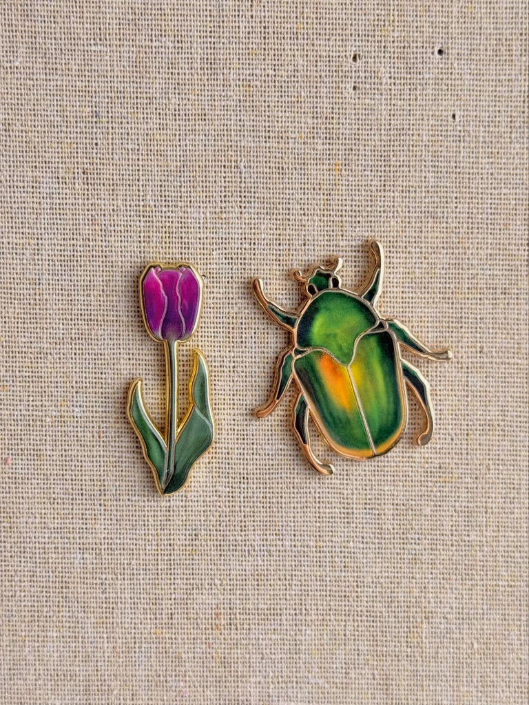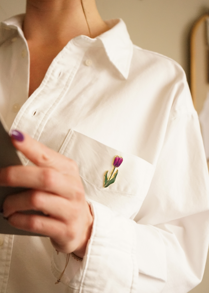 The Fuchsia Tulip Pin features vibrant hand painted colors then printed on our sleek light gold colored metal. It's like wearing a mini garden on your lapel or fave bag! Add a pop of color to your everyday look with this hand-painted, light gold pin. It's a must-have for any flower fanatic.