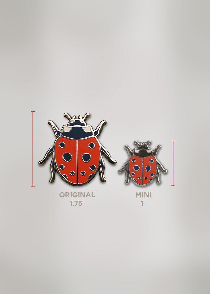 Our best-selling ladybug pin in cherry red now comes as a mini pin! Add this little pollinator to your bag, lapel, hat, or shirt to complete your botanical look. Makes for the perfect statement accessory or gift for someone special. Made with A-grade enamel on silver-colored metal. Each one secures with one soft rubber clutch.