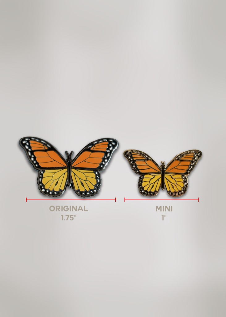 Our best-selling orange monarch pin now comes in a mini set! Show off this little pollinator set on your apparel, bag, or pin board. You can also share one with someone special. Made with A-grade enamel on gold-colored metal. Each one secures with one soft rubber clutch.